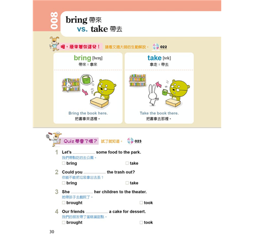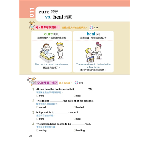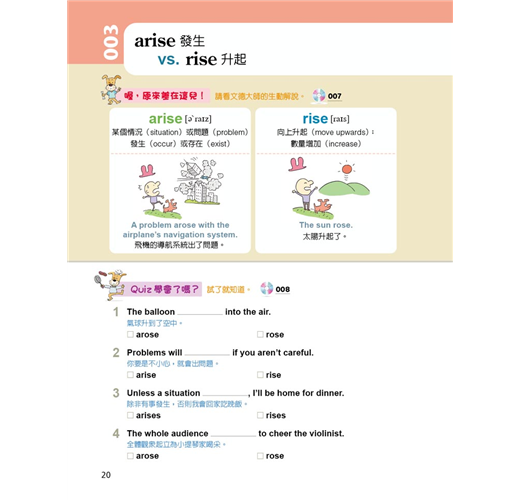 「學習單字」最怕的是:因為沒有100%的理解如何在某種語境下正確使用、而造成錯誤。這本《英文老師沒教,但最愛考的單字》把學生容易混淆的單字羅列出來,加註文字釋義,還利用圖片的方式,創造「語境」,促進正確理解,幫助記憶。再者,此書富含練習題,透過作答,對於剛才習得的單字,腦中會浮現「圖像式語境」,讓選字作答的流程更為順暢無疑。