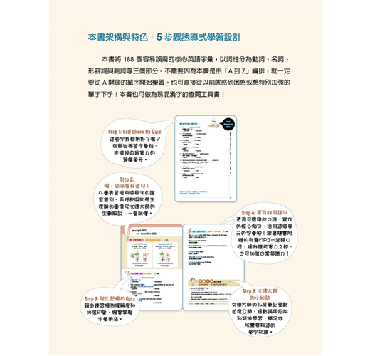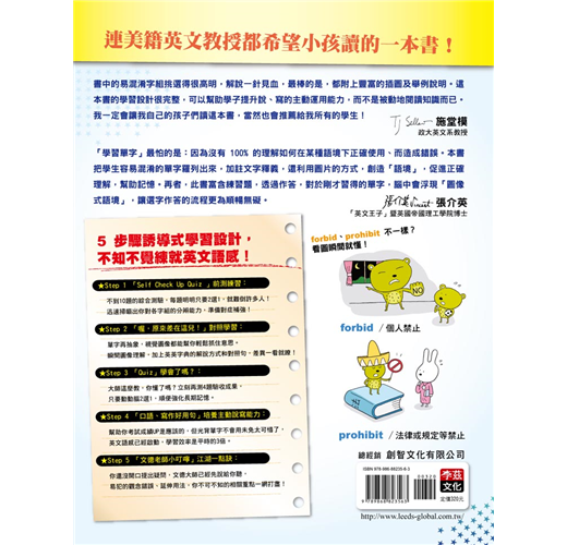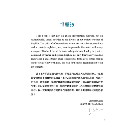 這本書不只是準備考試有用,只要是有心想把英文學好的學生,都應該要擁有這本超實用的工具書。書中的易混淆字組挑選得很高明,解說一針見血,最棒的是,都附上豐富的插圖及舉例說明。這本書的學習設計很完整,可以幫助學子提升說、寫的主動運用能力,而不是被動地閱讀知識而已。我一定會讓我自己的孩子們讀這本書,當然也會推薦給我所有的學生!