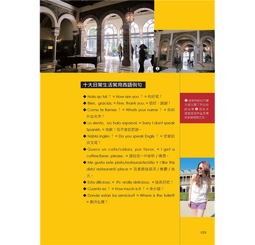 ◎收錄常用西語應急:旅行途中難免遭遇到語言不通的煩惱,于恬特地在書中刊載了生活常用的西語,以協助讀者解決燃眉之急。