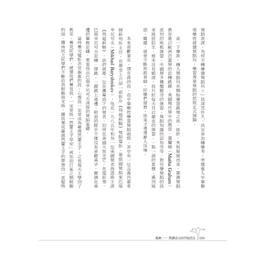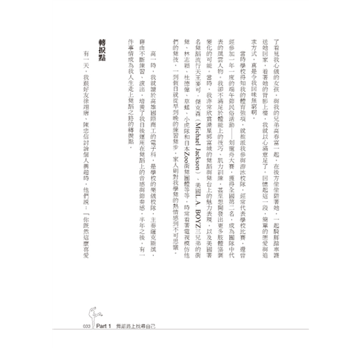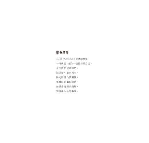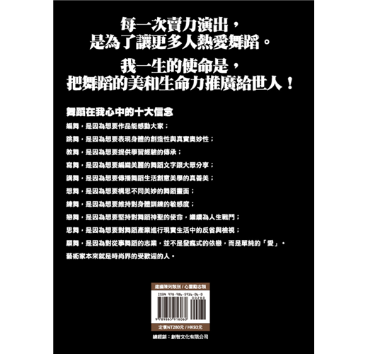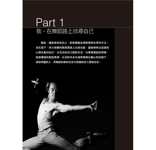 此書是我從事舞蹈表演十七年來的心路歷程,是心得與感悟。提出來與大家讀者分享,我的見解與方向、反思、反省,讓更多人關注舞蹈文化現象與發展趨勢,讓我們的後代年輕藝術學子,有繼續前進的學習動力,讓真正「藝術生活化、生活藝術化」,進而美化我們人類的心靈與悸動吧。