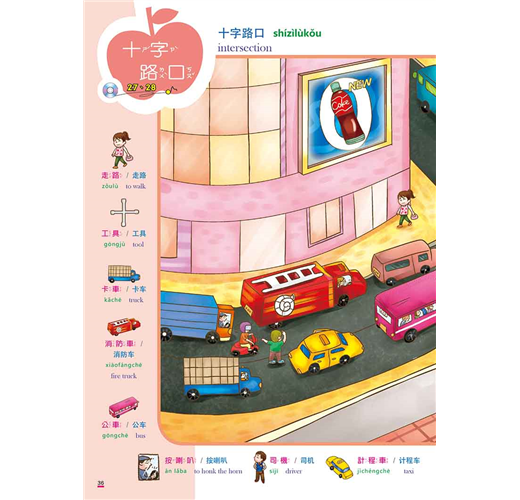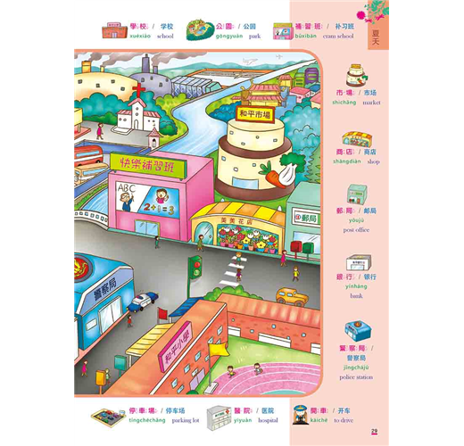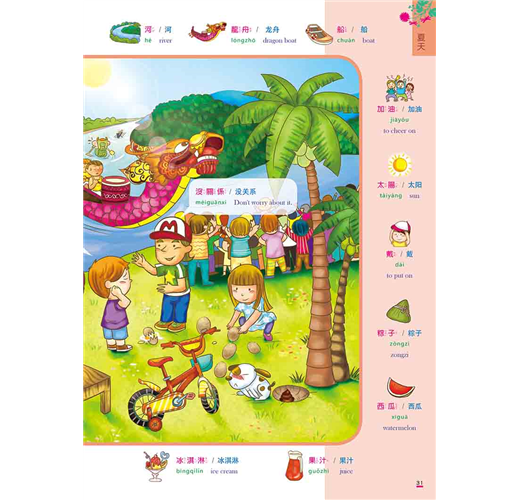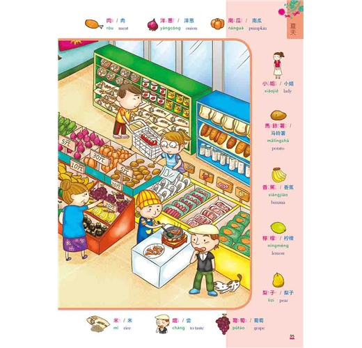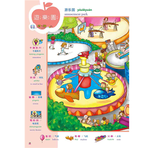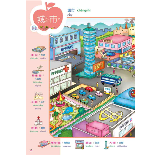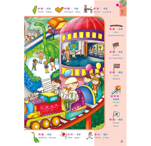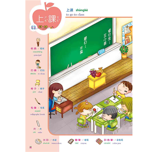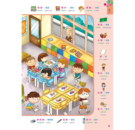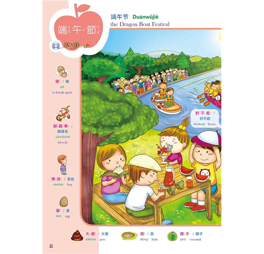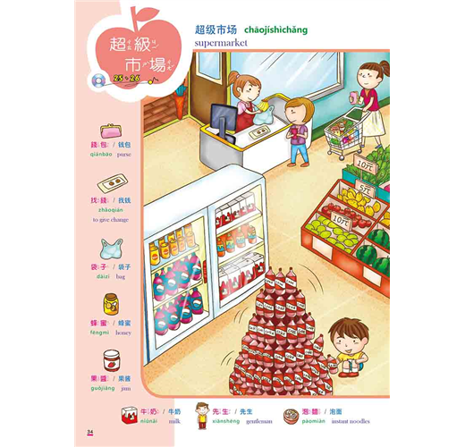 Each scenario/thematic unit comes with a fun picture and vocabulary in traditional and simplified characters with pinyin and Mandarin phonetic symbols as well as English explanations.