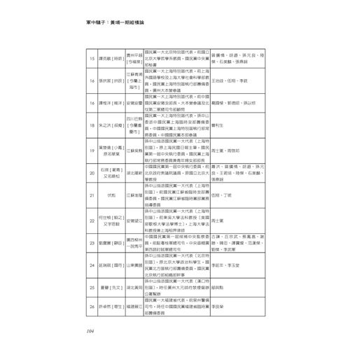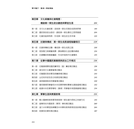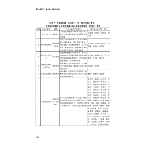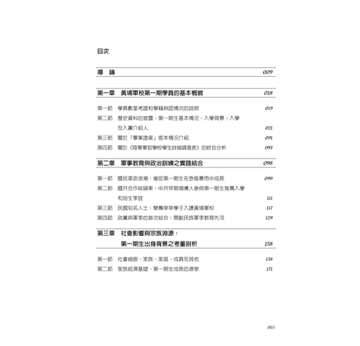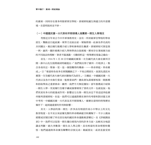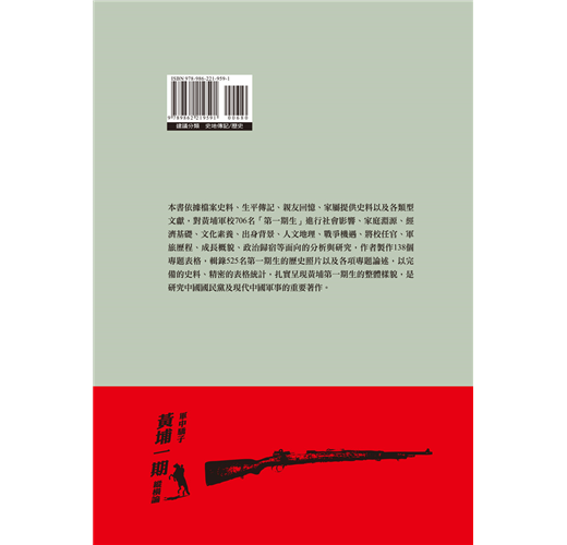 本書依據檔案史料、生平傳記、親友回憶、家屬提供史料以及各類型二手文獻,對黃埔軍校706名「第一期生」進行社會影響、家庭淵源、經濟基礎、文化素養、出身背景、人文地理、戰爭機遇、將校任官、軍旅歷程、成長概貌、政治歸宿等面向的分析與研究,作者製作138個專題表格,輯錄525名第一期生的歷史照片以及各項專題論述,以完備的史料、精密的表格統計,扎實呈現黃埔第一期生的整體樣貌,是研究中國國民黨、中國共產黨及現代中國軍事的重要著作。