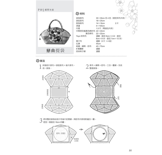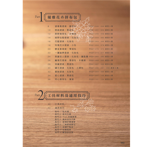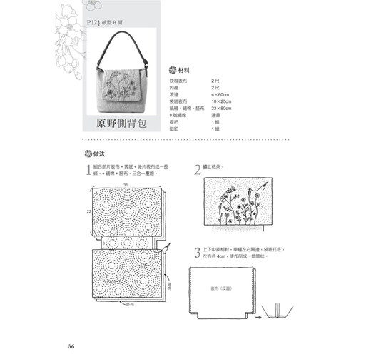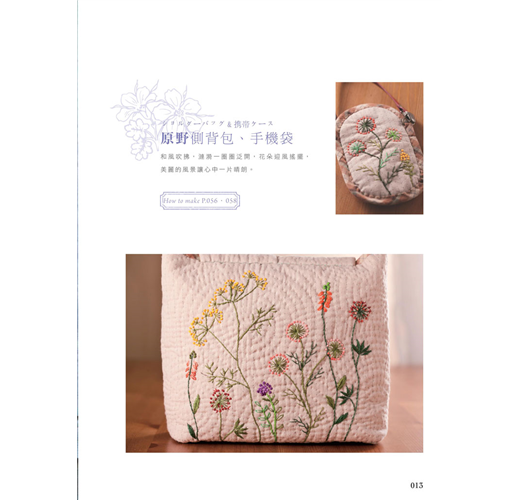 以自然花卉之姿態為主題,運用貼布縫及刺繡等技巧細膩摹擬,手縫製作一個個擁有美麗風景的拼布包,循序漸進的做法繪圖,讓人從零開始了解特殊包型如何踏實完成,用閒暇時間好好醞釀出絕無僅有的美麗包款。