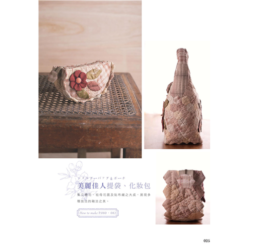 32件細膩拼接的手縫拼布包,花與葉美麗交織的貼布刺繡,直線與同心圓壓線的立體手感,