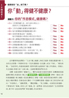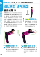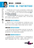 內容詳細介紹從「自我健檢」開始(含:肌力和體能年齡、「亞健康現象」、「呼吸正確嗎?」等),再依個人狀況選擇:中醫經典「呼吸法」、文明防治「對症操」、懶忙人最愛的「坐椅操」,搭配「要穴按摩法」,以及一動顧全身的「養壽甩老操」等,每動都標示出:意念關注部位、伸展筋骨的力度時間、運用關節的要領方向,以及協調四肢的訣竅等,配有超大圖解及大字說明,自我練就輕鬆健效!