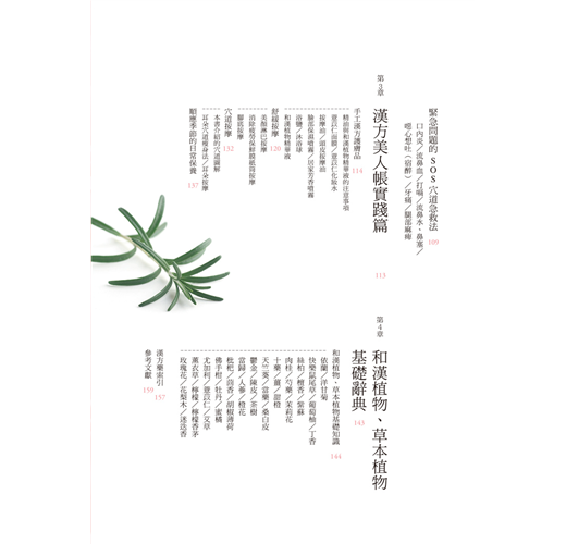 所謂漢方,並不只是吃漢方藥而已,更根據漢方理論巧妙運用添加香氛按摩油的精油與花草茶,研發出漢方帖(解決之道)。無論是對芳香療法有興趣的讀者,亦或是想充實泡澡時光的讀者,想要療癒不適、恢復健康美麗,一定要開始嘗試最天然的「漢方美容法」。