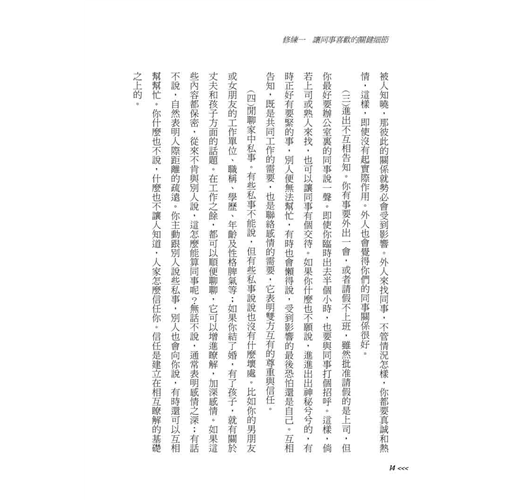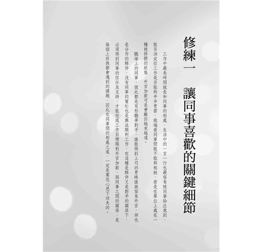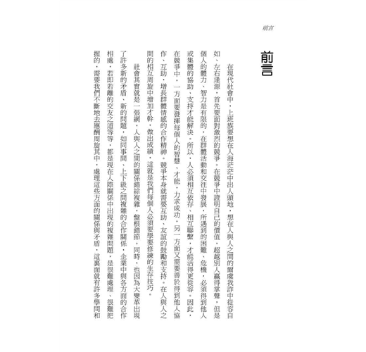 人必須相互依存、相互聯繫,才能活得更從容。因此,在競爭中,一方面要發揮每個人的智慧、才能,力求成功,另一方面又需要善於得到他人協作、互助,增長群體情感的合作精神。競爭本身就需要互助、友誼的鼓勵和支持。在人與人之間的相互周旋中增加才幹,做出成績,這就是我們每個人必須要學要修練的生存技巧。