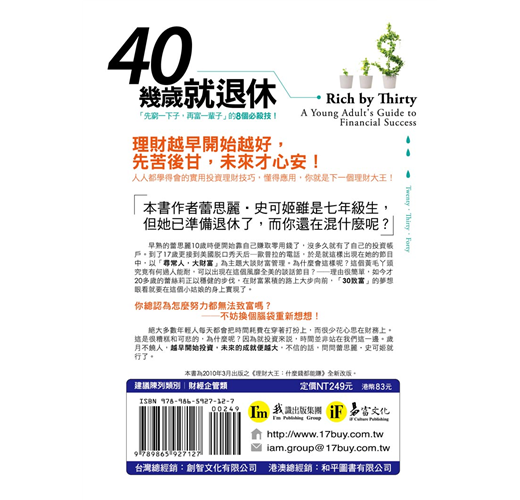 為什麼會這樣呢?這個黃毛丫頭究竟有何過人能耐,可以出現在這個風靡全美的談話節目?理由很簡單,如今才20多歲的蕾絲麗正以穩健的步伐,在財富累積的路上大步向前,「30致富、40退休」的夢想眼看就要在這個小女孩的身上實現了。而這本《40幾歲就退休:「先窮一下子,再富一輩子」的8個必殺技!》更是引起眾多美國讀者矚目,爭相推薦!你也想和蕾思麗一樣在30歲前就變有錢人嗎?那麼絕對不能錯過本書。
