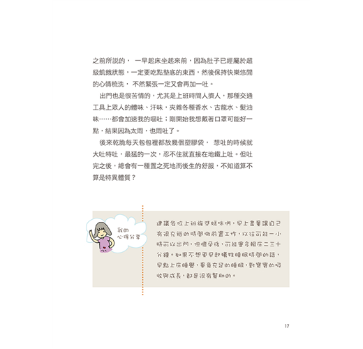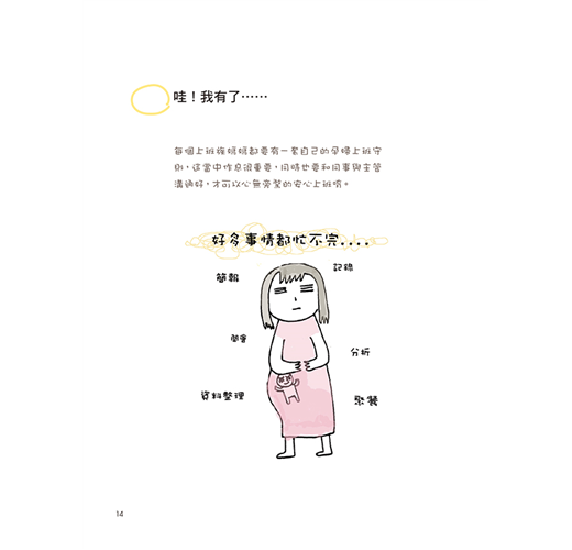 很高興我可以讀到這本書,正是每一位懷孕女人最想拿在手上的「準媽媽使用手冊」。 蔡佩樺小姐將孕婦的憂慮與需要藉由簡單可愛的圖文,鉅細靡遺地分成懷孕、生產、重回職場三階段描繪出來,把所有準媽媽在討論、在猶豫的大小事項,都寫進這本書裡。