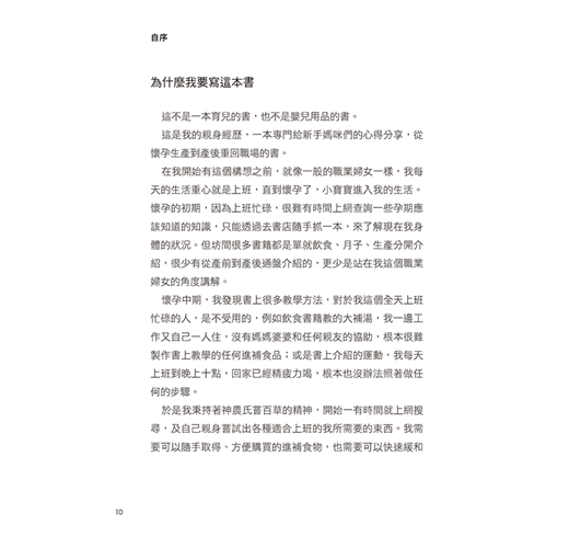 懷孕的初期,蔡佩樺因為上班忙碌,很難有時間上網查詢一些孕期應該知道的知識,只能透過去書店隨手抓一本,來了解身體的狀況。但仿間很多書籍都是單就飲食、月子、生產分開介紹,很少有從產前到產後通盤介紹的,更少是站在職業婦女的角度講解。