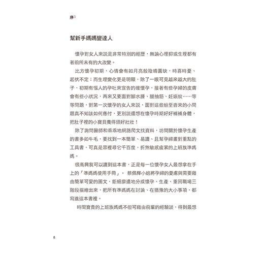 除了詢問醫師和乖乖地網路爬文找資料,坊間關於懷孕生產的書多如牛毛,要找到一本簡單、易讀、且幫孕婦劃對重點的工具書可真是眾裡尋它千百度,折煞敏感疲累的上班族準媽媽。