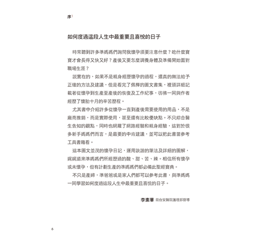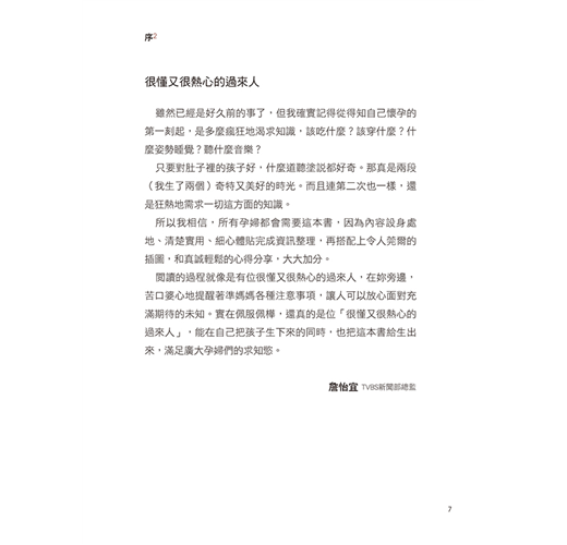 閱讀的過程就像是有位很懂又很熱心的過來人,在妳旁邊,苦口婆心地提醒著準媽媽各種注意事項,讓人可以放心面對充滿期待的未知。實在佩服佩樺,還真的是位「很懂又很熱心的過來人」,能在自己把孩子生下來的同時,也把這本書給生出來,滿足廣大孕婦們的求知慾。