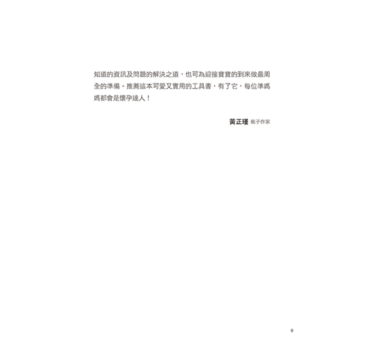 時間寶貴的上班族媽媽不但可藉由前輩的經驗談,得到最想知道的資訊及問題的解決之道,也可為迎接寶寶的到來做最周全的準備。推薦這本可愛又實用的工具書,有了它,每位準媽媽都會是懷孕達人!