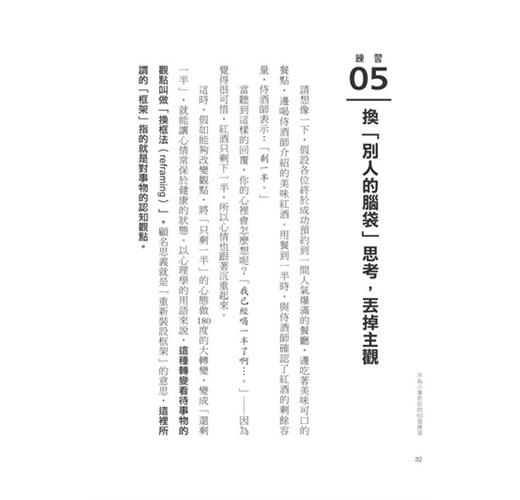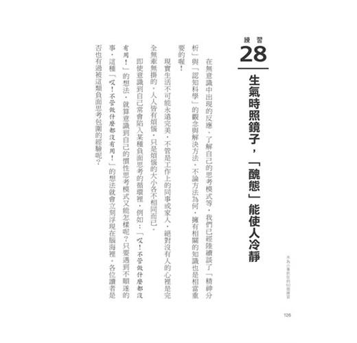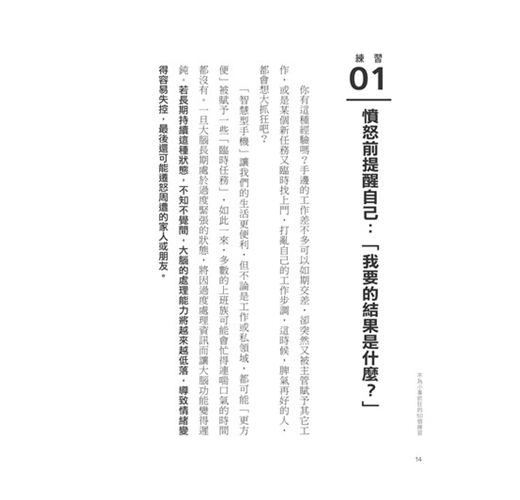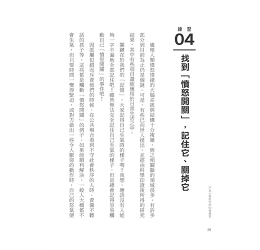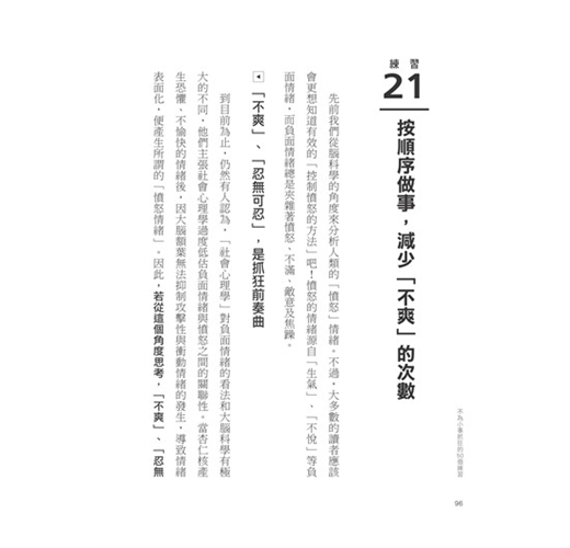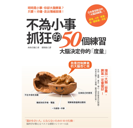 因此,身為精神科權威的作者要告訴我們,「度量」大小並非與生俱來,而是由「腦容量」決定的,只要活用本書中的50個練習,提升大腦和情緒的處理能力,就能成功增加「度量」。當我們的「度量」越大時,就不容易為小事生氣。正如情緒可以控制,「度量」當然也能靠練習增加,包括: