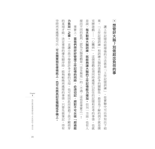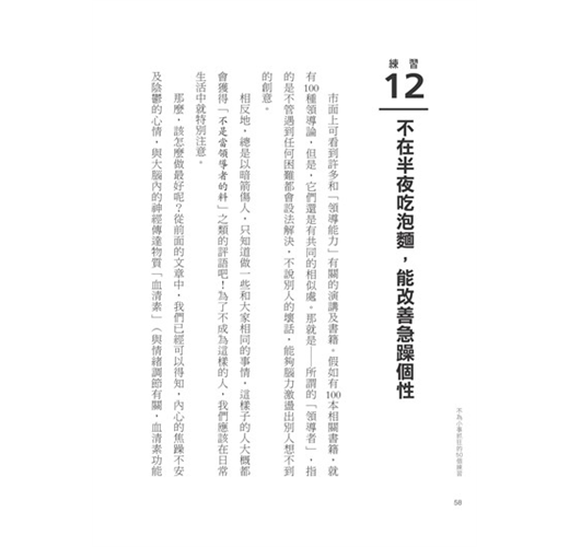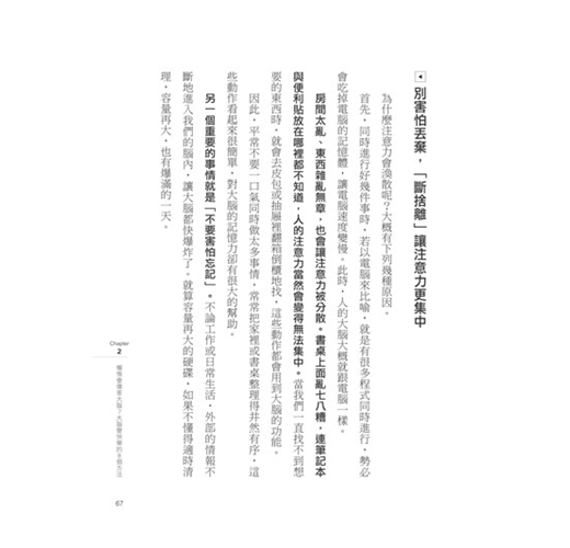 本書由7個章節構成,即使平時忙於工作的人,只要能將書中提到的50個練習落實於日常生活中,就能有效率地提升大腦處理能力,讓自己變成一個有度量的人。不管是已經擁有許多部屬的大老闆、立志成為企業家的學生,望子成龍、望女成鳳的父母親,或希望自己在能力上或人格特質上能夠常保年輕有活力的人,這本書都能夠幫助你改造自己的大腦容量。