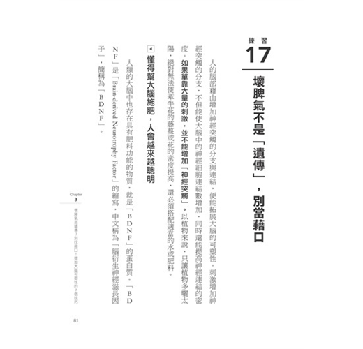 作者西多昌規醫生透過自己每月看診300多人的真實臨床經驗,及國內外的研究數據,提出50個最有效鍛練大腦的科學方法,幫你有效控制情緒,告別容易抓狂的自己。
