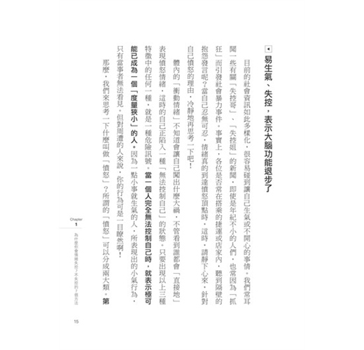 每天打開報紙、新聞,你是不是也發現,酒後鬧事、家暴、激烈口角等,情緒失控的人越來越多了呢?為了一點小事情就大發雷霆、一言不合就大打出手,甚至,連走在路上被別人多看兩眼都感到不爽,像這樣的「失控哥」、「失控姐」,正急速增加中。沒人願意一天到晚生氣,但卻總是hold不住自己的脾氣,於是,「度量小」、「修養差」的標籤開始跟著自己,讓你不禁大喊:「我真的不是故意的,可是,我實在控制不住我的脾氣啊!」的確,如果可以選擇,誰會想當沒人緣的討厭鬼呢?