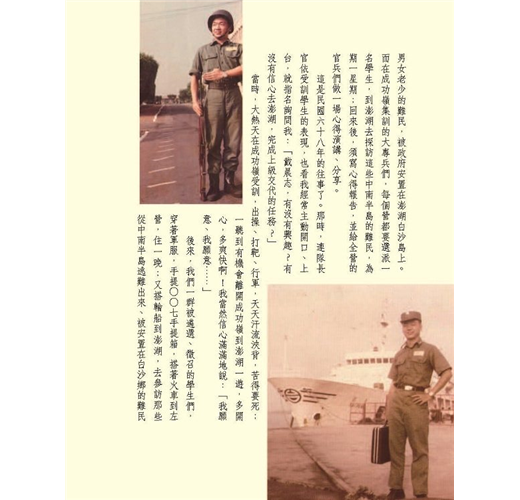 後來,我們一群被遴選、徵召的學生們,穿著軍服,手提○○七手提箱,搭著火車到左營,住一晚;又搭輪船到澎湖,去參訪那些從中南半島逃難出來、被安置在白沙鄉的難民們,並順道一遊澎湖各風景名勝。回成功嶺之後,我也勇敢地面對全營弟兄,上台報告參訪的心得……
