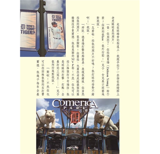 「拜託,德曼楊打擊率那麼差,表現很糟糕,你居然拍他的照片,很丟臉耶!你要拍,也要拍老虎隊最強的塞揚獎投手韋蘭德,他是美聯的MVP耶!不然,你也可以拍三棒強打卡布瑞拉,他是球隊的打擊、打點、全壘打的三冠王……」兒子很內行地對我說。