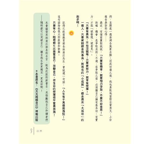 本書謹借用林清江部長的名言,做為改版的新書名,來惕勵我自己和讀者們──隨時都可以突破自己,讓自我生命更精采、更美好啊!