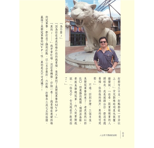 「真的?……」我平常忙碌,沒空看轉播,仔細一看──德曼楊在連續四場的冠軍賽,都打出了勝利打點,以二支全壘打、六打點、打擊率三成七五的佳績,贏得了美聯冠軍賽的MVP。哇,真的是太不可思議了!