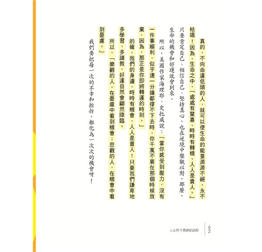不向命運低頭,要麻雀變鳳凰 把每一次挫折,化為一次次的機會 美國作家海理耶.史托威說: 「當你感受到壓力, 沒有一件事情順利, 似乎連一分鐘都撐不下去時, 你千萬不要在那個時候放棄, 因為,那正是你即將轉運的時刻。」