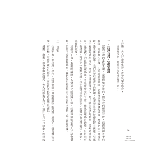 相信看完這本書,會讓你徒步環島的勇氣與信心大增,原來不常運動的肉腳夫妻+四歲娃娃,還是可以完成超省錢的徒步環島行,不過更重要的是將還引領你我對生活態度、教養問題、城鄉風貌、環境與經濟的取捨等問題的深度思考。