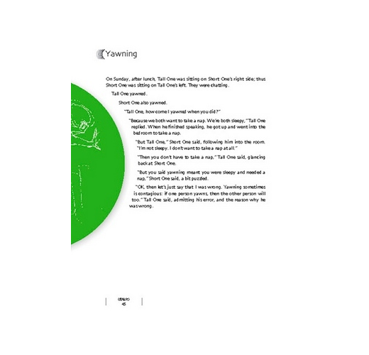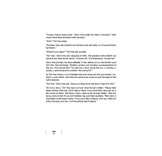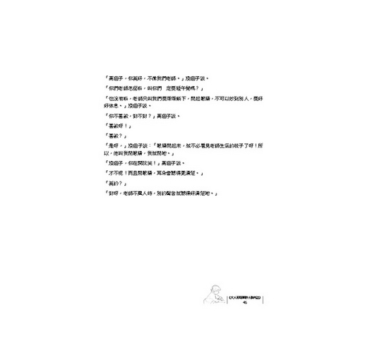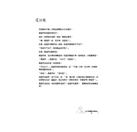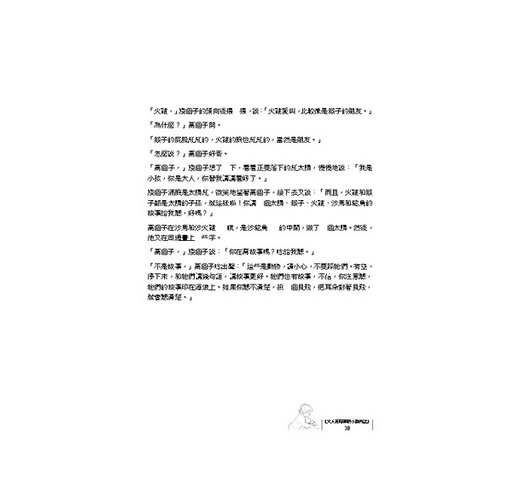 「有什麼不一樣,你唸一段給我聽。」矮個子翻翻書,說:「你們大人的書都沒有圖畫,不像我們小孩的書好看。」