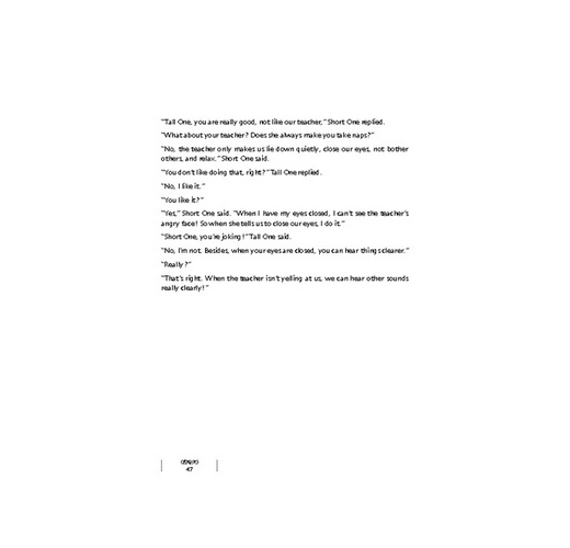「今天我不想聽小孩的書。」矮個子看完她該看的,翻身對高個子說:「你在看什麼?」高個子正在看一本小說。