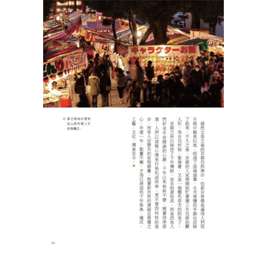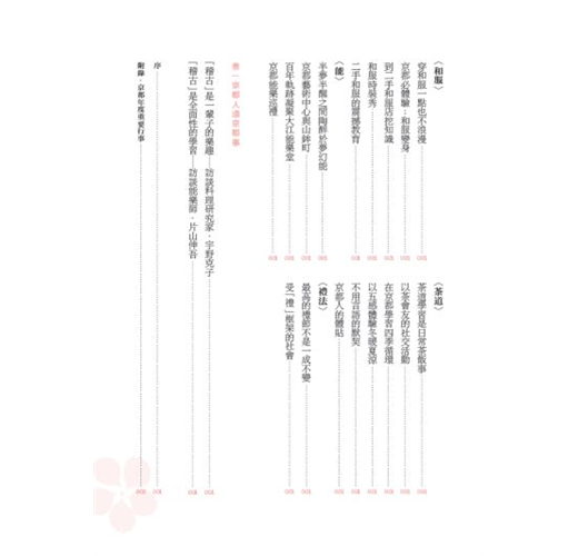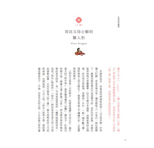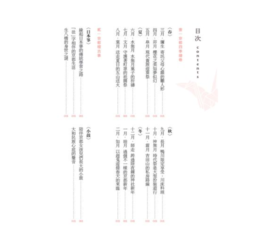 在長期居住京都以及嚴謹的日本傳統技藝研習之下,她發現不同於一般遊客所認識的京都:除了櫻花楓紅和靜謐古寺之外,京都其實是一部活生生的日本文化史。她以一個在地學習的外國人身分,深入接觸瞭解最真實的京都,包括每個月份的行事祭典與最佳體驗方法、隨著四季遞嬗而各具特色與意涵的和菓子,以及最道地、京都式的日常禮節與應對。透過分享學習日本傳統技藝的點滴,道盡京都文化性格的養成,呈現京都身為一個文化古都所蘊含的深厚價值與驕傲。