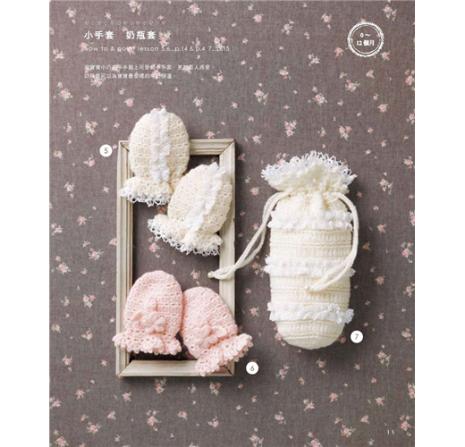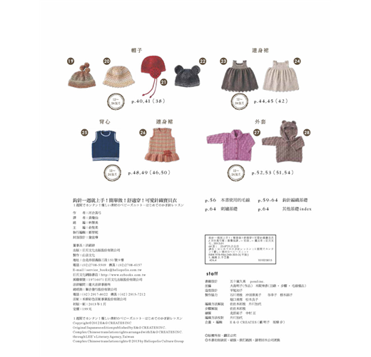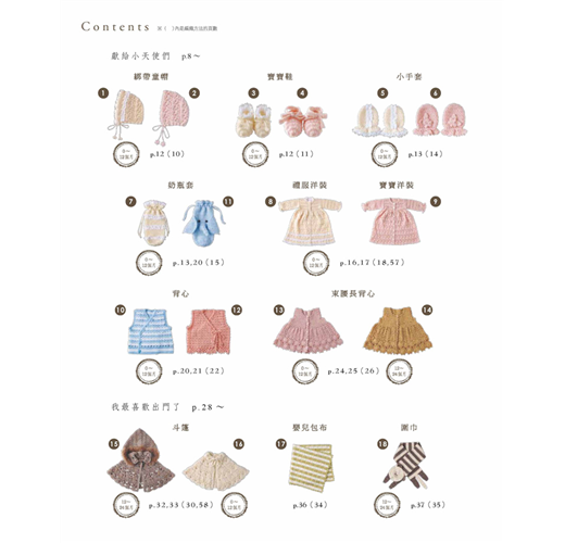 本書收錄各式各樣的寶寶行頭,從童帽、寶貝鞋、小襪襪、奶瓶套,到女孩子的洋裝、男孩女孩皆適宜的背心、斗篷,爸媽揹寶貝時所需要的包巾,還有冬日時讓寶貝暖呼呼不會受到風寒的圍巾、外套,全部一樣樣與你分享。