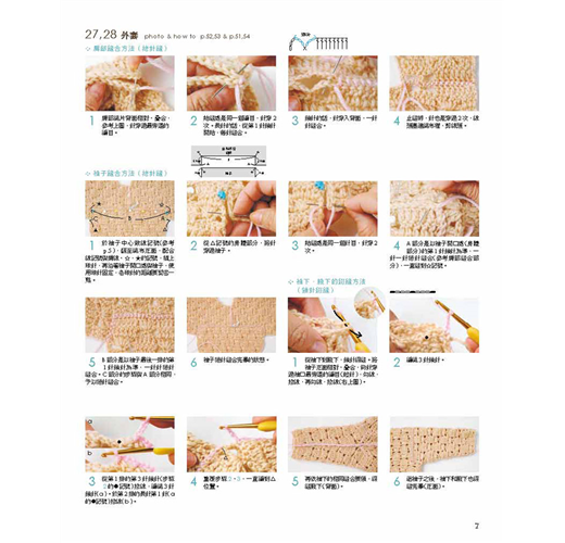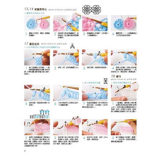 從起針、使用鎖針輪狀編織、平編的編入方法、鎖針、引拔針、中長針3 針的變化玉針2 針編1 針的方法、配色條紋的編織方法、圖案花片的編織、接合方法、接線方法……所有技巧,依步驟分圖詳解說明,讓你從初學者立即上手進階為鈎針達人!