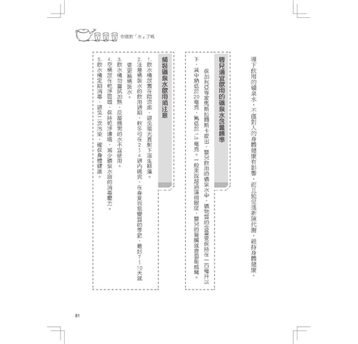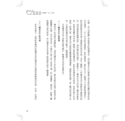 在本書的最後,作者還幫助大家解讀了日常生活中人們對水的誤解,將很多常被忽視的健康問題還有錯誤觀點提出了建議和更正。