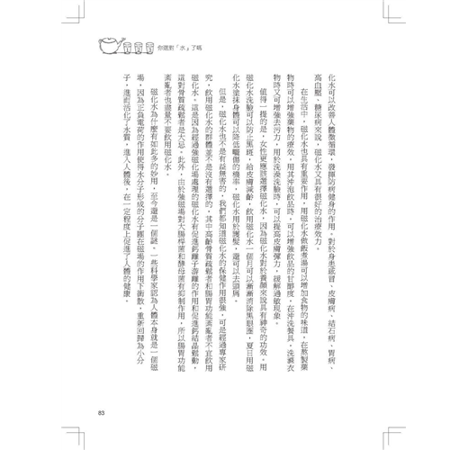 事實上,水能揭示一切死亡和病痛的謎團,它的藥效價值,堪比最佳的治癒心絞痛、便祕、失眠和抑鬱等疾病的藥物。它的美容價值,能讓女人在不知不覺中化身 水嫩美人,能讓男人也擁有好皮膚、好氣色。水還是一個愛搗蛋的精靈,你得由著它的脾氣和秉性,當燒水時,要恰到好處,還要放置三分鐘,在清晨時,你又不能 讓它和鹽為伍,它可以幫你戒菸,還能夠改變寶寶尿床的習慣,甚至會施展魔力讓你一年四季都神采奕奕。水就是這樣單純,但又很複雜。關於水的知識千千萬萬, 怎麼選水,什麼時間喝水,吃藥時怎麼喝水,喝水杯子怎麼選擇等等問題的存在,又讓水變得妙不可言。