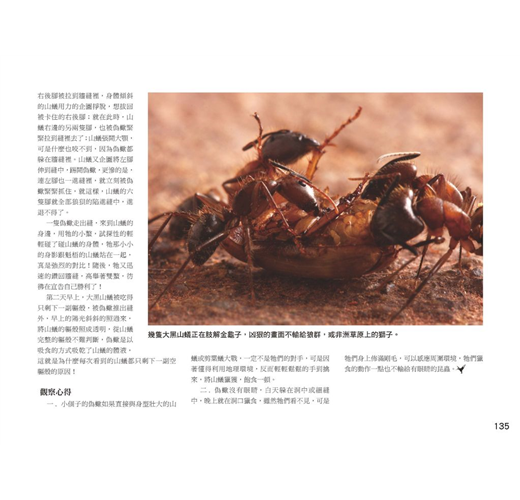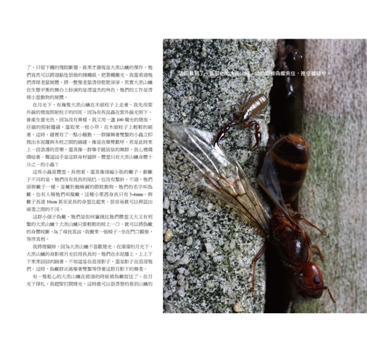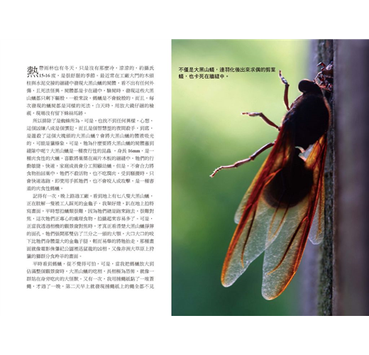為了每個月交稿,不得不更深入的走入千奇百怪的昆蟲世界中,從起初這些像是沒有大腦,被人類列為低等動物的小蟲,到後來從牠們的生活行為中,看到了以人類的邏輯根本無法理解的大智慧,才體悟出,原來牠們的生命與組成比我想像中的精密奧妙太多了。