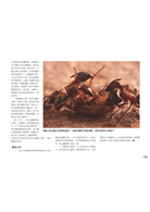 我喜歡看行軍蟻狩獵作戰,牠們進攻時,是由小個子負責搜索攻擊,有一雙大顎的大個子則張著大口,頭朝外負責隊伍兩側的防守,牠們在搬運獵物時,是不分個頭大小的,一旦隊伍在行進中遇到障礙無法繼續前進時,走在前面的會立刻自動互相前後肢互鈎,以身體懸空搭起一座臨時橋,讓戰友踏著自己的身體通過,牠們的行動迅速且手腳俐落,是一支訓練有素、默契十足的作戰部隊。可是,我從沒有見過行軍蟻集合出操演練,而且作戰時沒有指揮官,數十萬行軍蟻靠著默契自動自發奮不顧身出征,為什麼沒有大腦的行軍蟻未經學習訓練,個個都像是與生俱來訓練有素的勇狠軍人?