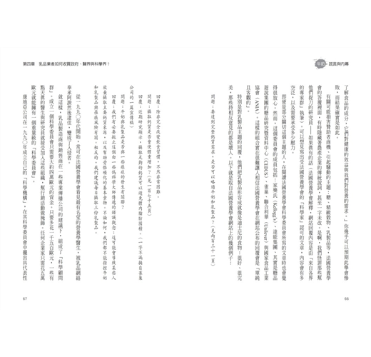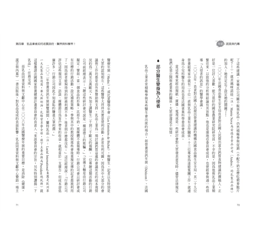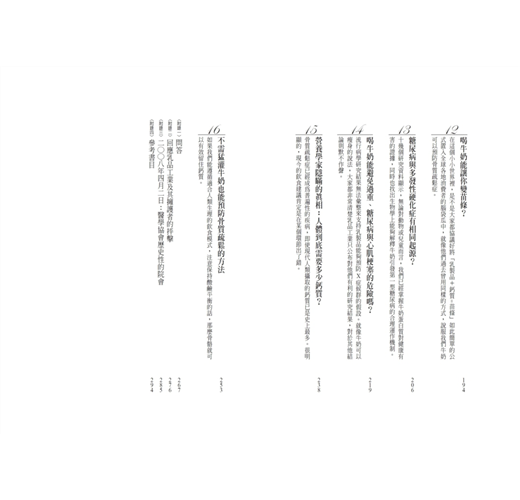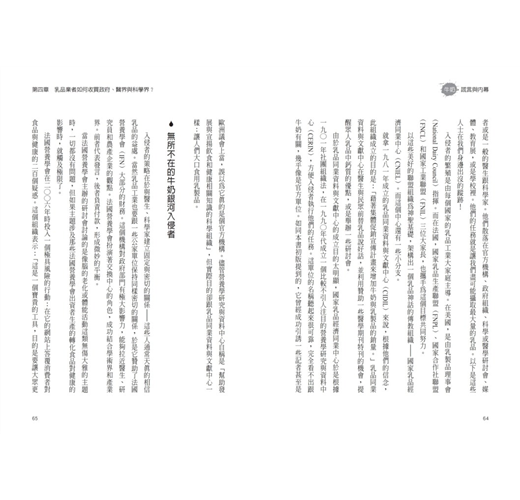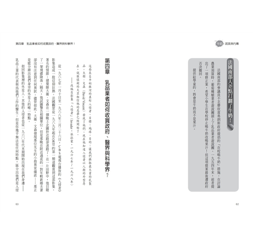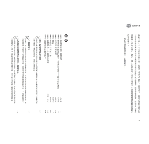 本書涵蓋三個內容:牛奶研究真相、乳品工業行銷內幕、牛乳與疾病間應當釐清的關係。