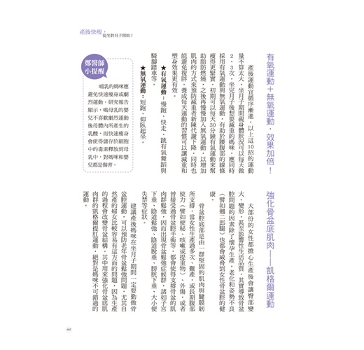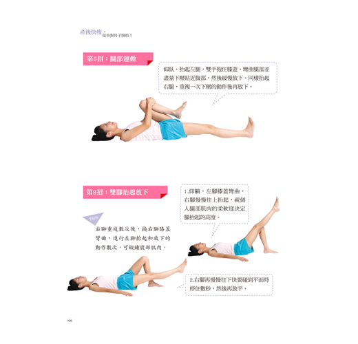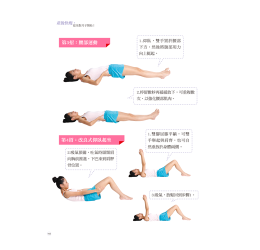 剛生產完的媽咪不太適合過於激烈的運動,宜循序漸進。尤其在坐月子期間運動的目標在於排除過多的水分、改善靜脈曲張,使鬆弛的腹部皮膚、陰道肌肉恢復彈性,運動的形式應較為和緩、適量,而坐完月子之後媽咪,檢去脂肪和消耗熱量則是新的目標,媽咪便可以從事較大量的伸展運動、體操、有氧運動以及戶外活動來協助健康瘦身。關於產後 運動塑身的進一步訊息請見本篇第三章「產後塑身運動,預備、起!」(請見第XX頁)。
