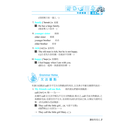 重要字辭均附例句,藉例句靈活運用單字及片語,增進讀寫能力。