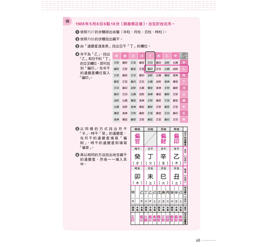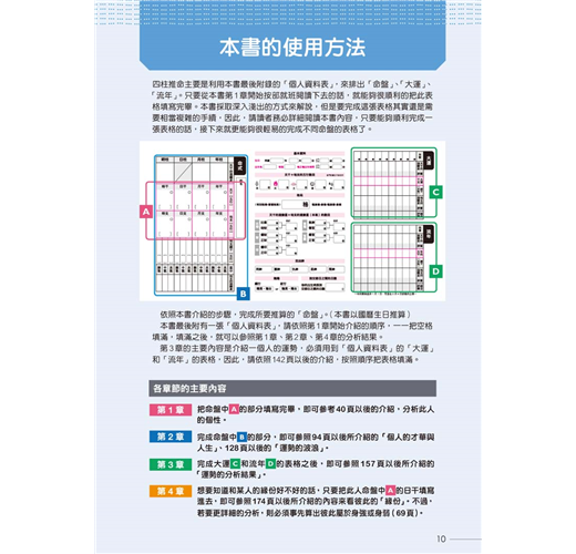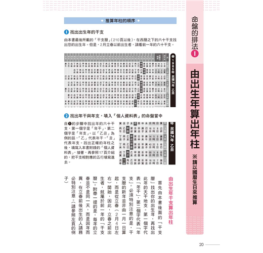 利用附錄的「個人資料表」,一步一步耐心解說排命盤的步驟。不用擔心看不懂,只要多練幾次就會相當熟練喔!