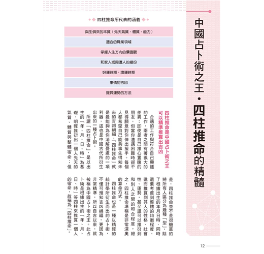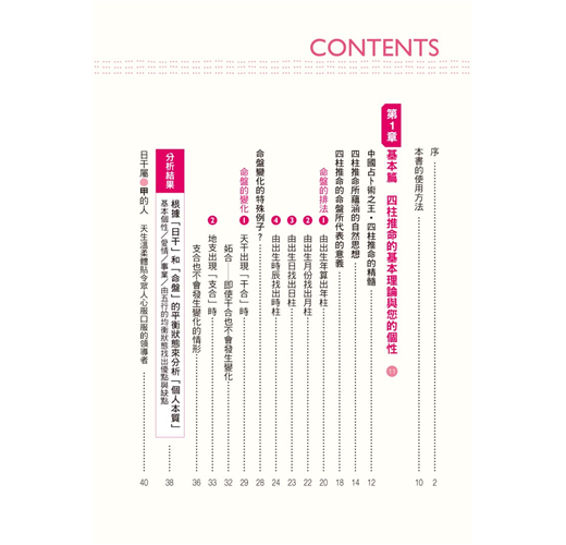 本書特別因應現代讀者的需求,把中國真正的四柱推命精華,採取簡單易懂深入淺出的方式介紹給讀者大眾。只要由第1章按部就班往下閱讀,再依照順序把個人資料填入最後附錄的「個人命盤表」,即可完成一張專屬命盤。再透過現代感的解說,讓你瞭解這些古文所代表的涵意,對「四柱八字」倍感親切,從此算命不求人!