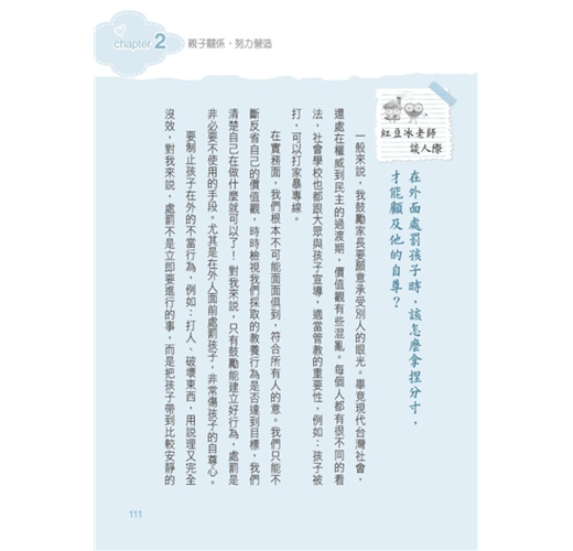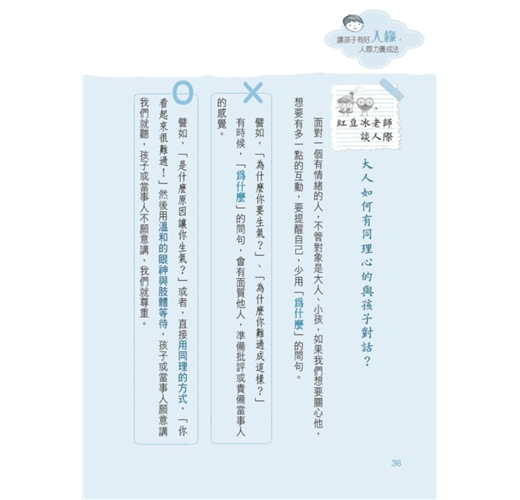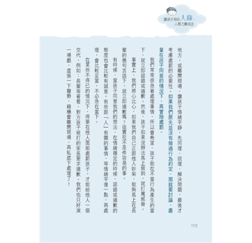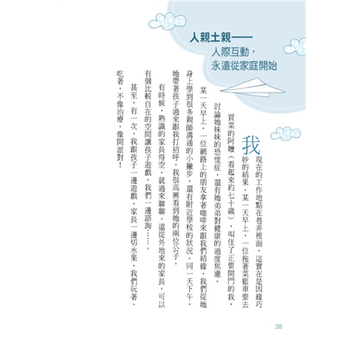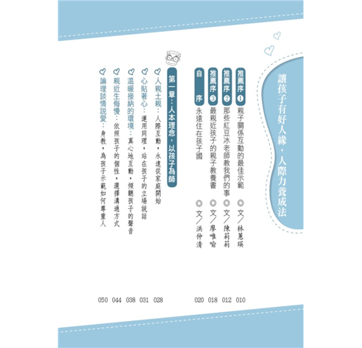這本《讓孩子有好人緣,人際力養成法》,也是他努力的成果之一。書中集結的兒童人際互動故事,看似隨筆抒發,實際上都是源自治療現場的深刻觀察與反省,為了讓更多朋友瞭解「人本遊戲治療」理念,老師避開了艱澀的醫學用語,也不使用瑰麗的詞藻堆疊文句,所有討論的議題均以孩子、家長、老師三者的互動和教養問題為軸心,提供的建議既非教條,也不唱高調,都是確實可供讀者師法依循的執行策略。
