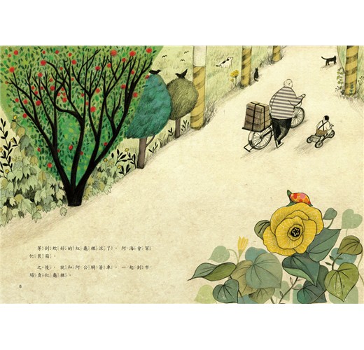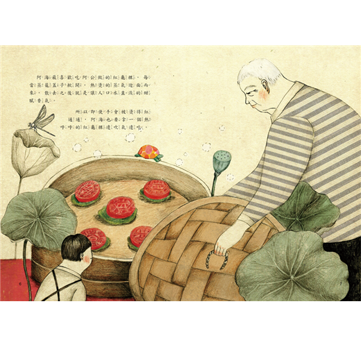 詩意的畫面,含蓄的文字,讓傳統的紅龜粿蛻變出前衛造型,將人生的缺憾柔化成童心的想像。一個紅龜粿印模,模印出了民間滋味,也模印出了祖孫之間的三代情。