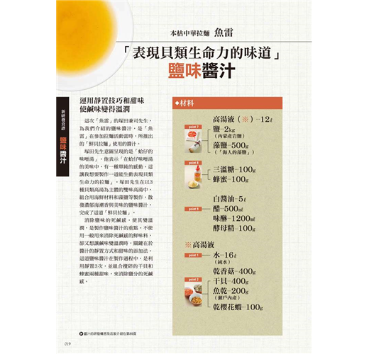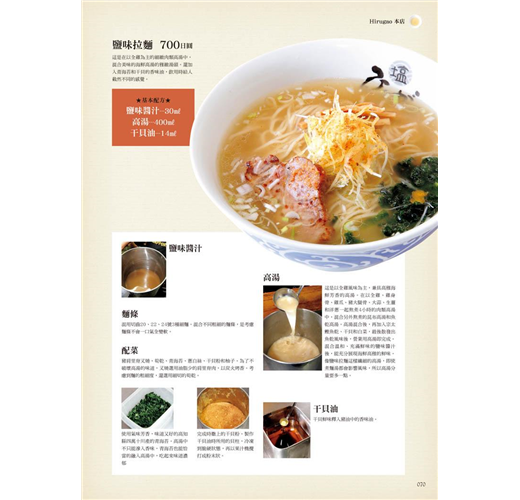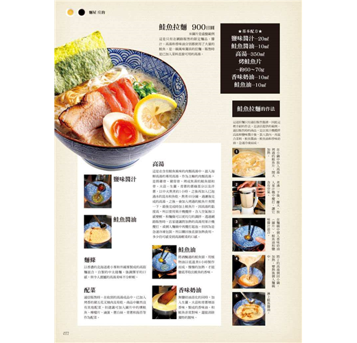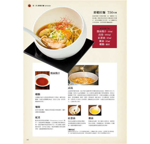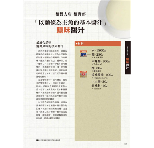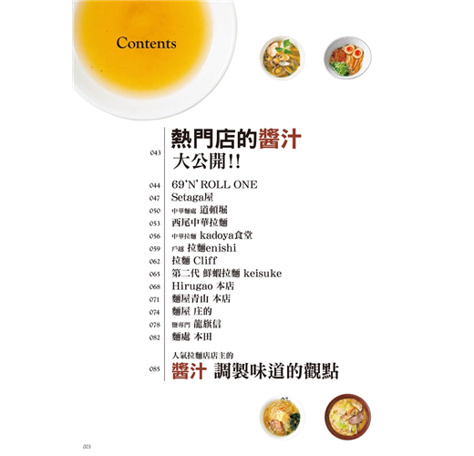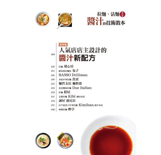 製作開店菜單固然是閱讀本書的主要目的,然而,更希望讀者透過本書介紹的醬汁,能夠領略著名拉麵店店主們,以追求自己的拉麵、沾麵為目標,不斷思考「如何做出更美味拉麵」,永無所謂完美終點的不懈精神與態度。