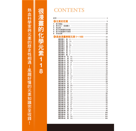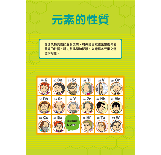 閱讀漫畫,就可看到此元素的發現者與發現的經過,以風趣、簡單易懂的方式描繪於其中。先看過漫畫,有了預備知識以後,再看左方頁面的說明文,這樣一來,了解元素就再也不是難事了!