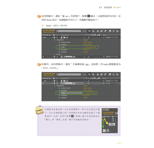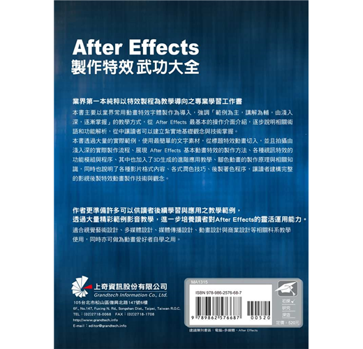 ■ 從觀念解講、動畫觀念與製作,特效應用到實務整合等整體演練,快速掌握After Effects動畫特效製作技巧。