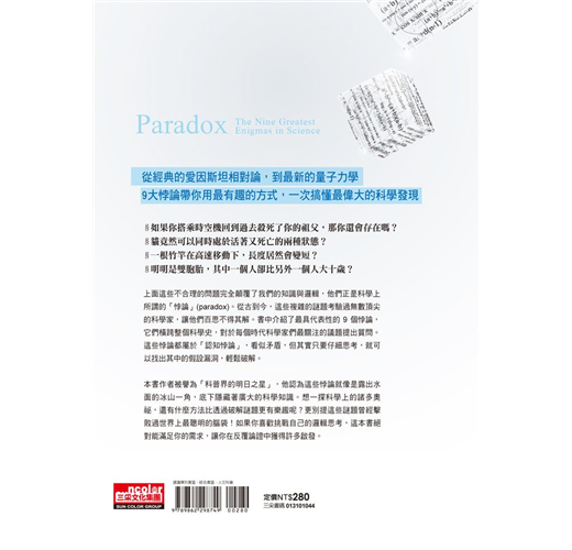 上面這些不合理的問題完全顛覆了我們的知識與邏輯,他們正是科學上所謂的「悖論」(paradox)。從古到今,這些複雜的謎題考驗過無數頂尖的科學家,讓他們百思不得其解。書中介紹了最具代表性的 9 個悖論,它們橫跨整個科學史,對於每個時代科學家們最關注的議題提出質問。這些悖論都屬於「認知悖論」,看似矛盾,但其實只要仔細思考,就可以找出其中的假設漏洞,輕鬆破解。