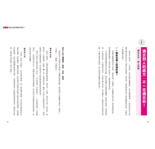 中醫立論是以人為本,以「症狀」、「體質」作為醫療重點,西醫是針對「病名」來治療。本書作者以中醫為出發點,更融合了西醫的科學保健功效,先讓讀者判斷自身體質屬性,再提供對症養生飲食法以及運動建議,包括: