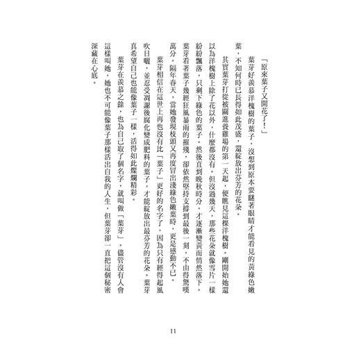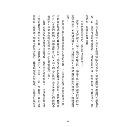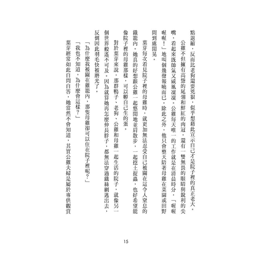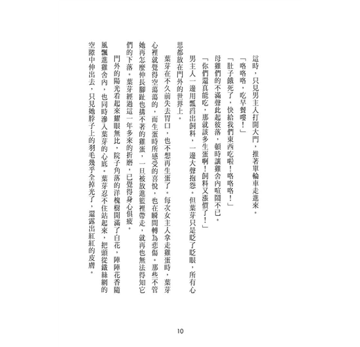 葉芽原以為來到院子後,就能跟那隻母雞一樣,和公雞一起養育小雞,過著幸福快樂的生活。但她很快就發現這完全是一廂情願的想法,而且打從一開始,院子裡就根本沒有她容身之處。葉芽縱使有滿腹委屈與不平,也不得不接受擺在眼前的殘酷現實。不過,她並沒有就此放棄,反而為自己找到另一條出路,毅然決然地離開了安全無慮的院子。