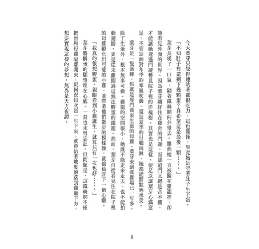 這什麼呀?這算哪門子主角?各位是否會有這種想法呢?大家不妨仔細思考一下。那些被關在雞舍裡的母雞究竟是抱著什麼樣的心態,又過著怎樣的生活呢?而住在院子裡的母雞,以及離開院子的葉芽又是如何呢?如果把牠們與人類做一比較,即可發現有些人活得像雞舍裡的母雞,有些人活得像院子裡的母雞,有些人又活得像葉芽一樣……。由此可見,這些母雞的生活方式正好可反映出各種不同的人生。然後再換個角度想想看,自己現在是過著什麼樣的生活,又想追求怎樣的人生呢?